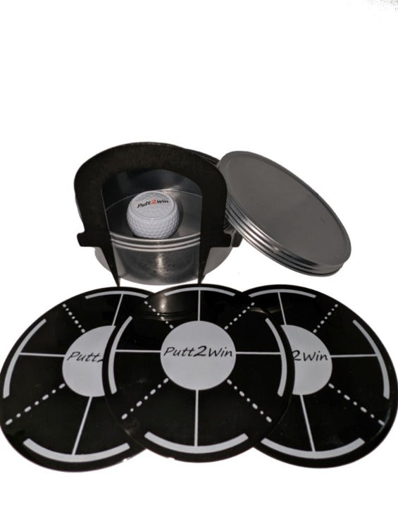 5.⛳ ✔️ PUTT2WIN GHOST TARGET HOLES X 3 – Three Putt2Win Ghost Target Holes are Included in the Putting Tin so that you can Create your own Hole anywhere on the Green or use them as Targets to Mark the Putts Break Point to Roll Over During the Balls Journey to the Hole. The Ghost Holes are made from Rubber, are Less than 1mm Thick & 10.8cm in Diameter the Size of a Golf Hole. A 12cm Tin is Included which Easily Slides into your Golf Bag and Conveniently Stores & Protects your Putting System.