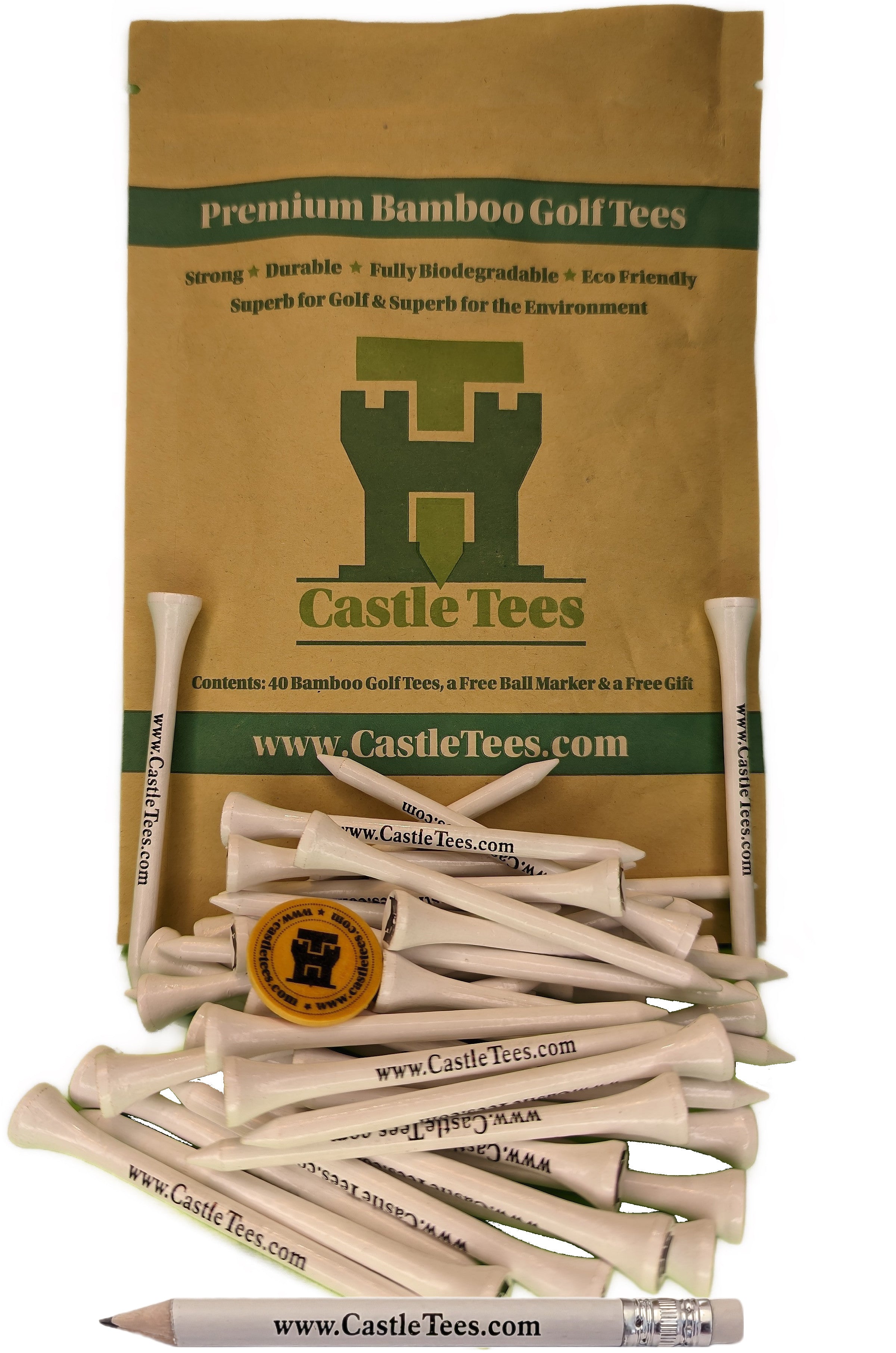 1.⛳ ✔️ White Straight Castle Premium Bamboo Golf Tees – Pack Contains 40 White Straight Tees x 83mm Tall, ideal for hitting a Driver. Castle Tees are supplied in a Biodegradable kraft paper Resealable Bag and come with a Free Ball Marker & a Free Pencil making them a Great Gift.