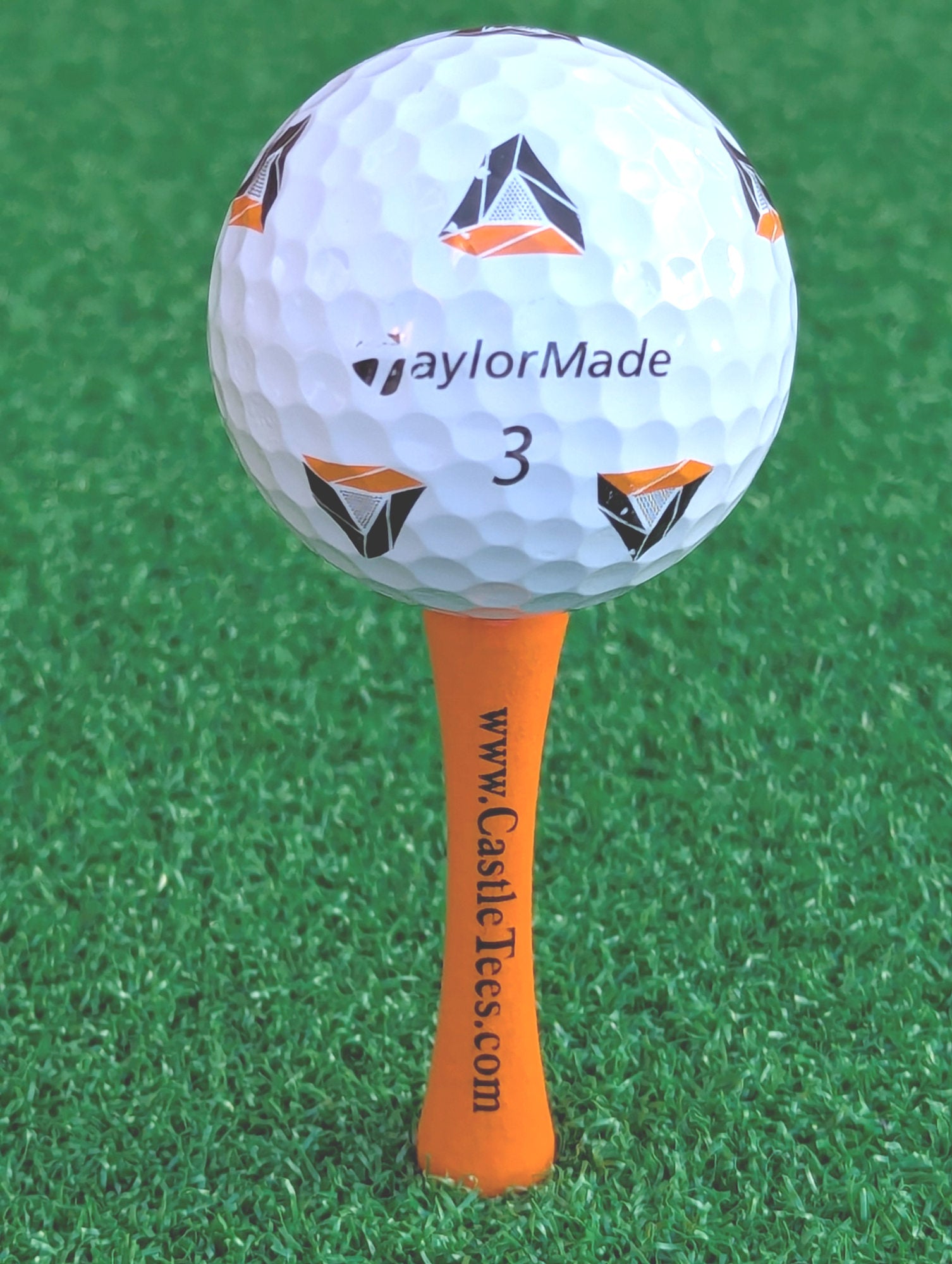 Castle Tees – 50 x 70mm (50mm + 20mm Step) / 2 ¾ Inches Orange Premium Bamboo Tees in a Biodegradable Kraft Box with 10 x 42mm Straight Tees, a Free Pitch Repair Tool, Free Ball Marker & Free Pencil. Made from Moso Bamboo which is twice as strong as regular bamboo & has a higher tensile strength than steel so they do not snap easily. Castle Tees are extremely strong & durable & fully biodegradable. Great for Golf, Great for the Planet & a Great Golf Gift.