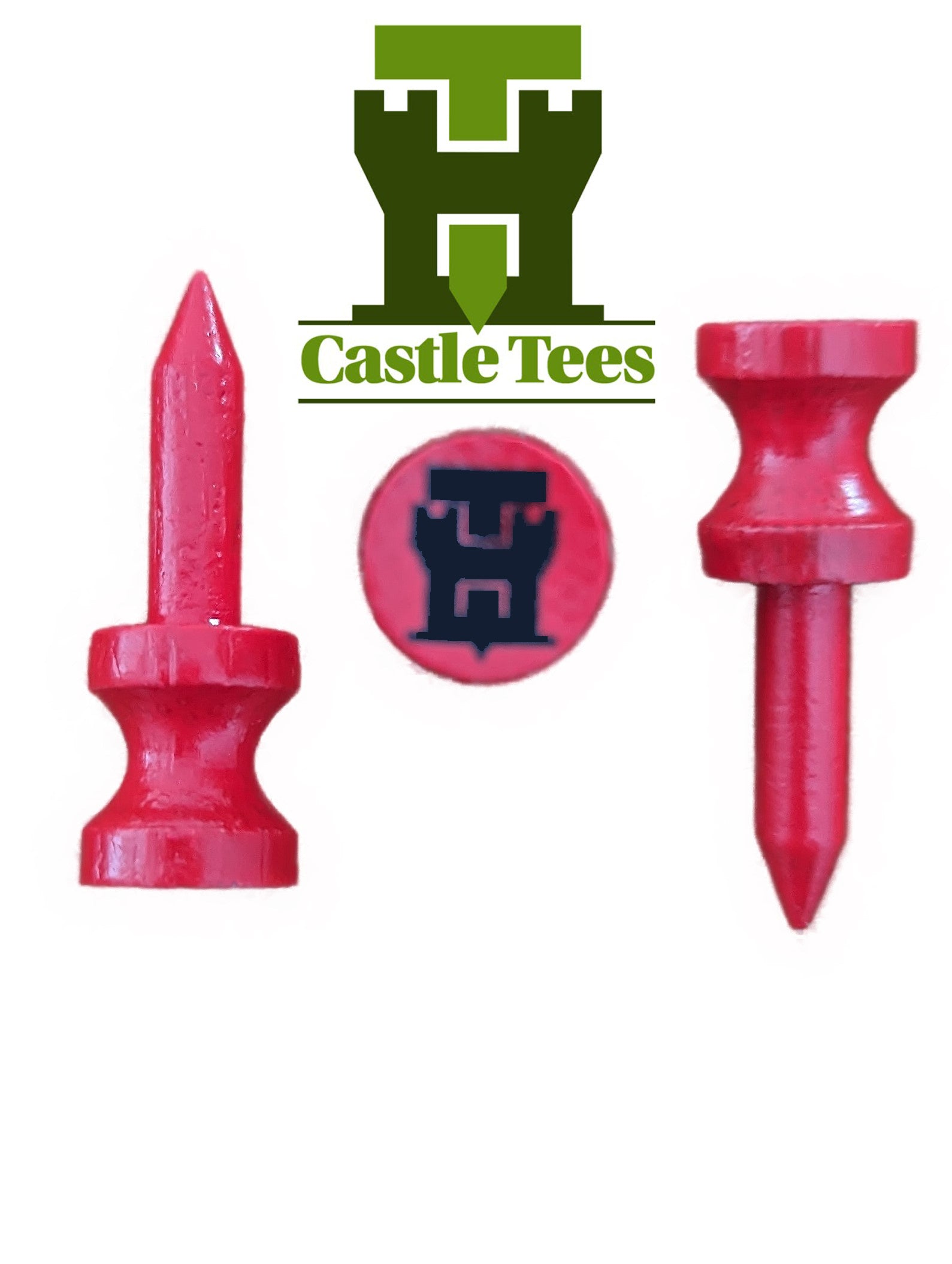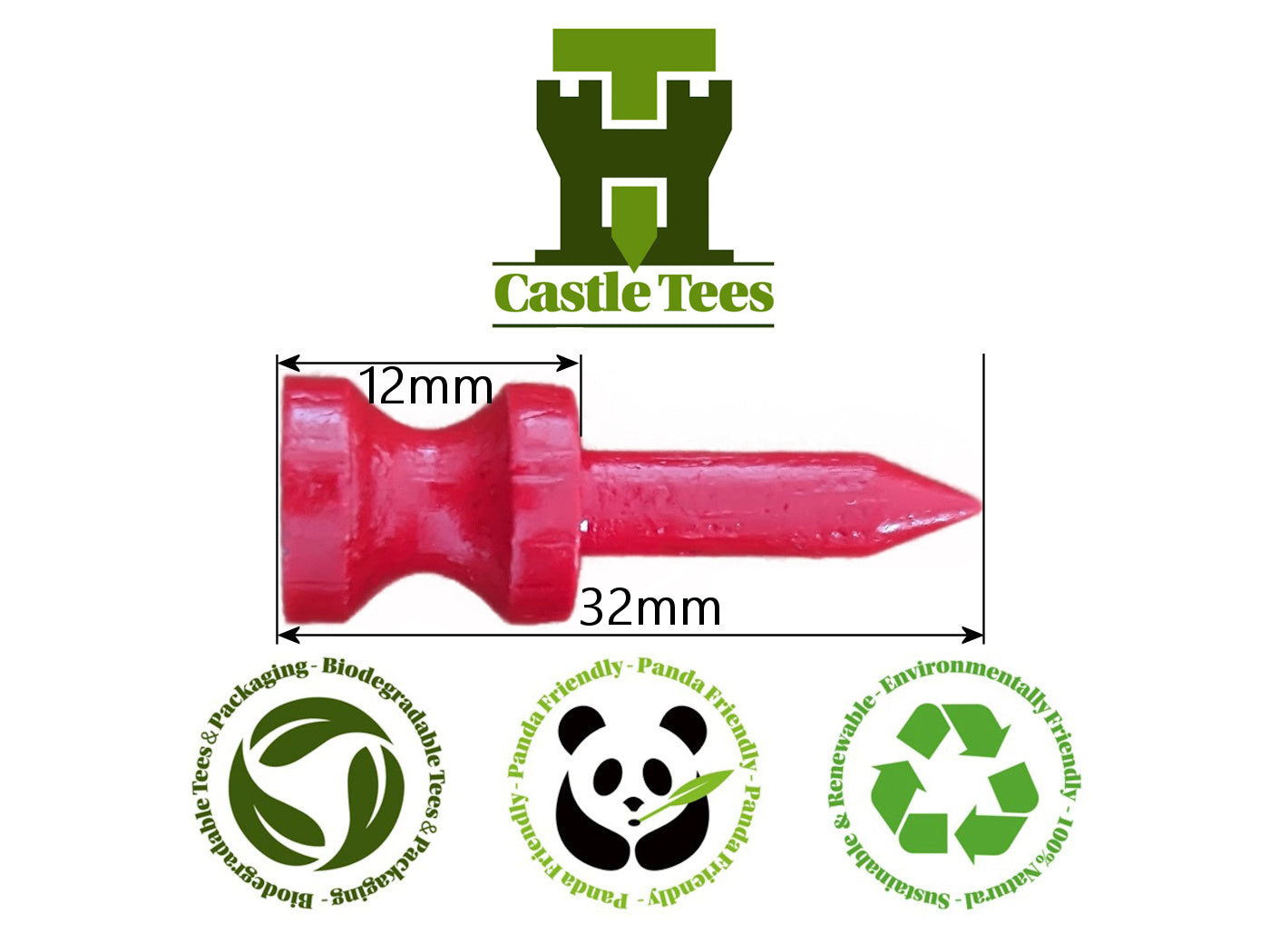 Official Castle Tees – 40 x 32mm (12mm + 20mm Step) / 1 ¼ Inch Red Premium Bamboo Tees in a Biodegradable Resealable Bag with a Free Pitch Repair Tool, Free Ball Marker & Free Pencil. Made from Moso Bamboo which is twice as strong as regular bamboo & has a higher tensile strength than steel, so they do not snap easily. Castle Tees are extremely strong & durable & fully biodegradable. Great for Golf, Great for the Planet & a Great Golf Gift.