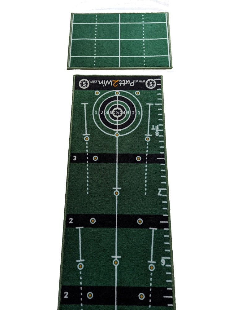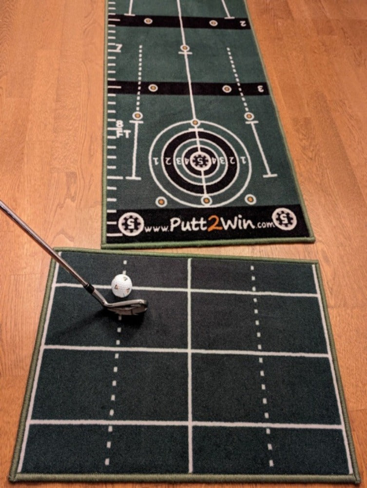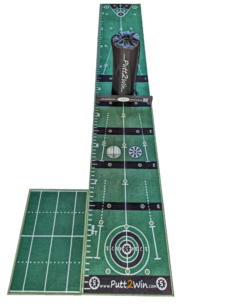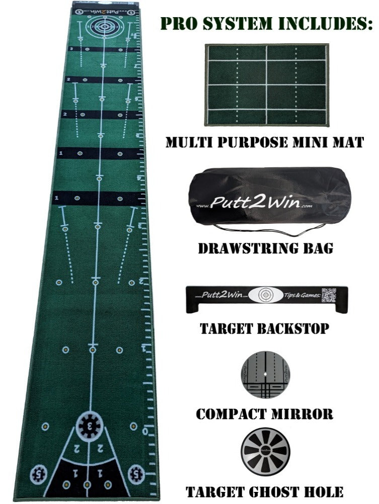 Putt2Win Pro Golf Putting and Chipping Mat | The Complete Short Game Improvement System for Golfers of all Ages who want to Play Better Golf | Packed with Practice Drills and Multi Player Games All the Family can Enjoy | Perfect to Practice Putting and Chipping Indoors and Out | Includes: Putting Green, Multi-Purpose Mini Mat, Compact Eye / Putter Alignment Mirror, Target Ghost Hole, Backstop Target Board and Drawstring Carry Bag.