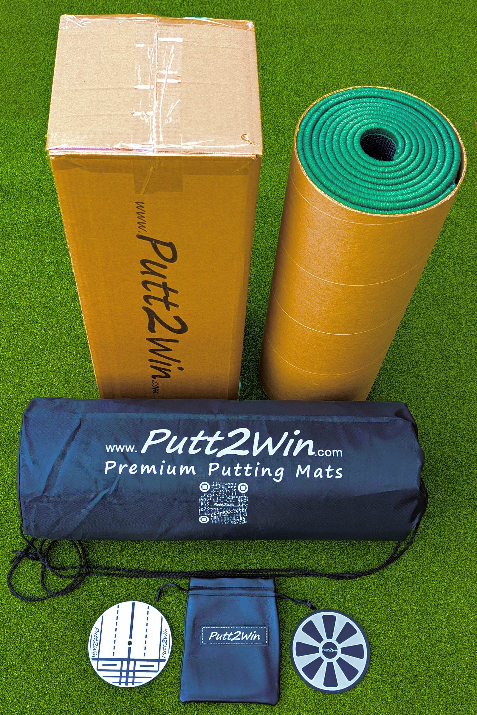 5.⛳ ✔️ Putt2Win IS EXCELLENT VALUE & A GREAT GIFT – Not only is the Putt2Win Training Putting Mat a Great Practice Aid it also comes with a Putting Mirror, Target Ghost Hole & a Drawstring Bag to Store them in. The Mat is Rolled Around and into Cardboard Tubes to Protect it when not in use which also helps to avoid Creases. The Mat Stores inside a Compact Drawstring Carry Bag when not in use and Easily Rolls out Ready to Practice Anytime Anywhere making it an Ideal Gift for anyone that Plays Golf.